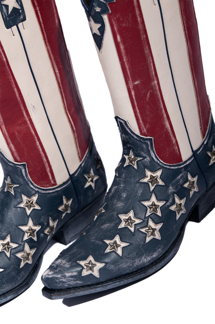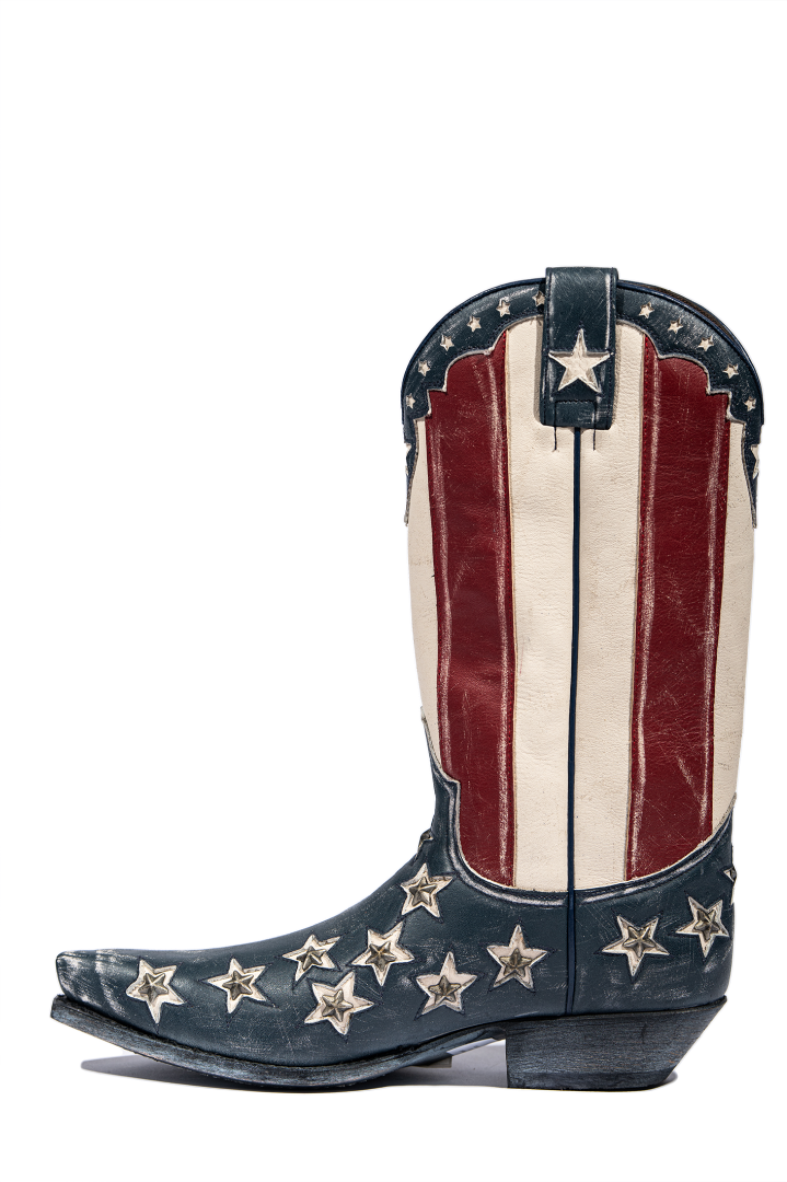 Een goede cowboylaars is niet meer weg te denken uit je garderobe. Deze westernklassieker is gemaakt van rood/wit/blauw geschuurd leer met een voet van dezelfde kleur leer samenstelling en fraai afgewerkt met ingelegde metalen sterren en opengewerkte sterren op de schacht. Deze laarzen hebben een spitse punt.