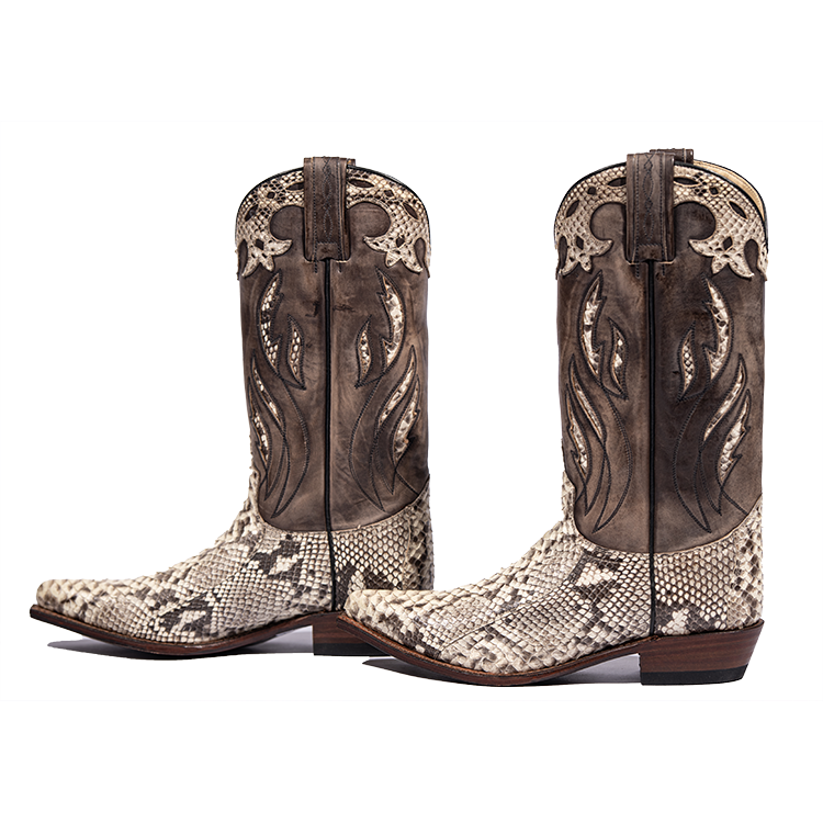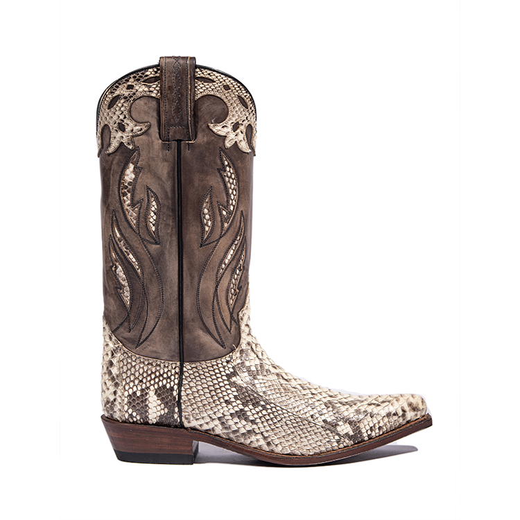 Een tijdloze Cowboylaars van Sendra in een mooie combinatie van taupe glad leer met een naturel python voet voor dames en heren.