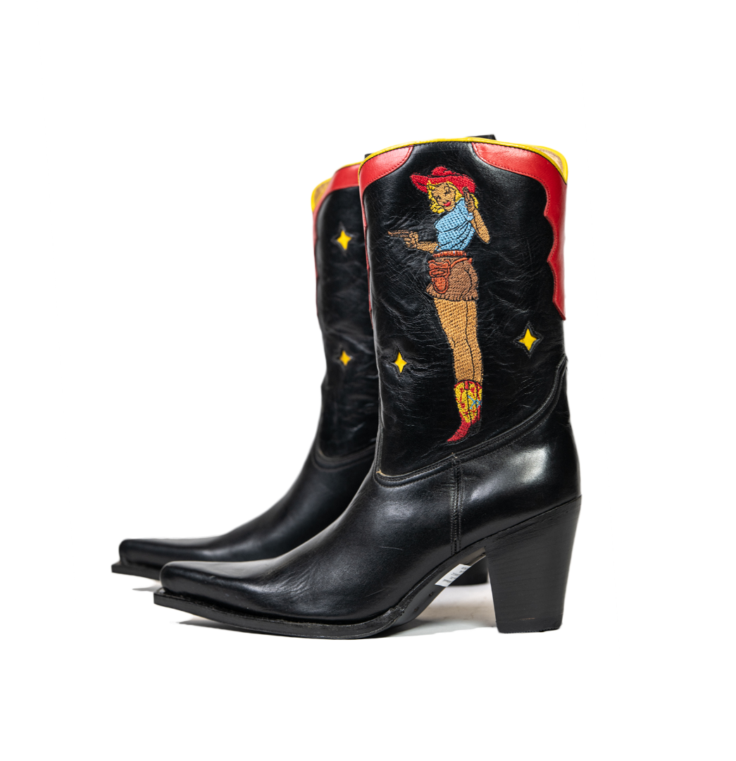Een goede cowboylaars is niet meer weg te denken uit je garderobe. Deze hippe westernklassieker is gemaakt van zwart leer met een gele ster op de voet en de schacht is rijkelijk versierd met een borduursel van een cowgirl. Deze laarzen hebben hoge hak en een spitse punt.